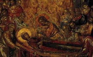«Νέκρωσιν η της ζωής μητέρα δέχεται, και τάφῳ τεθείσα, μετά τρίτην ημέραν ευκλεώς εξανίσταται εις αιώνας τῳ Υιῷ συμβασιλεύουσα και αιτούσα την των πταισμάτων υμών άφεσιν.»Ας έχουμε τις πρεσβείες της Θεοτόκου και την προστασία της!