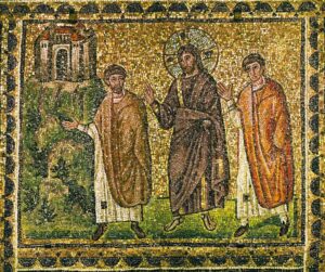 Ο αναστημένος Χριστός εμφανίζεται στους δύο μαθητές καθ’ οδόν προς Εμμαούς, Μωσαϊκό της Βασιλικής του Αγίου Απολλιναρίου του Νέου, Ραβέννα, 6ος αι