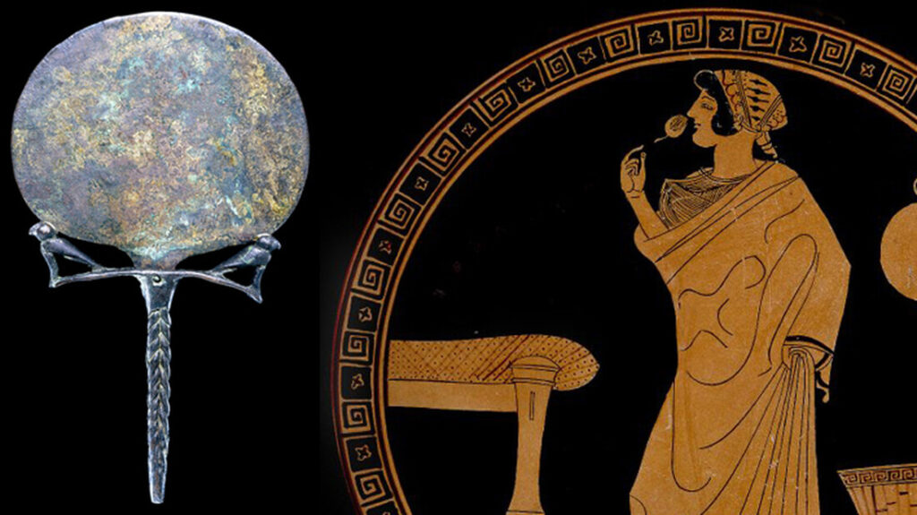 8)Τὰ κάτοπτρα στους αρχαίου χρόνους κατασκευάζονταν από στιλβωμένο μέταλλο, συνήθως χαλκό ή ασήμι. Υπήρχαν εκτός των μονών και τα πτυκτά, τα πτυσσόμενα κάτοπτρα. Σε αυτά ο λείος χάλκινος δίσκος έφερε για προστασία ένα κάλυμμα, επίσης χάλκινο, που το σήκωνε η γυναίκα με τη βοήθεια κρίκου.