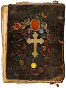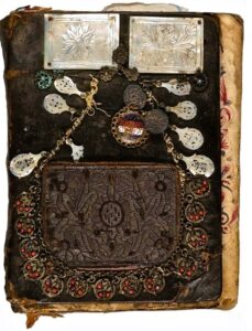Armenian Gospel Book, ca. 1675-1725. Calf-binding with mother-of-pearl plaques, gilt metal, bead necklace, metal thread embroidered floral panel forming a pocket, two coins, metal bracelet, gilt metal crossand