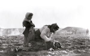 Armenian woman kneeling beside dead child within sight of help and safety at Aleppo