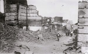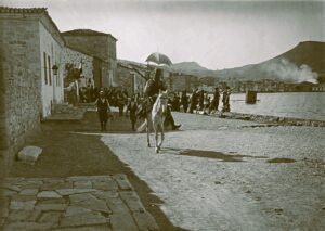 Ottoman bandits parading with loot in Phocaea on 13 June 1914. In the background Greek refugees and burning buildings. (Phocaea massacre Sartiaux)