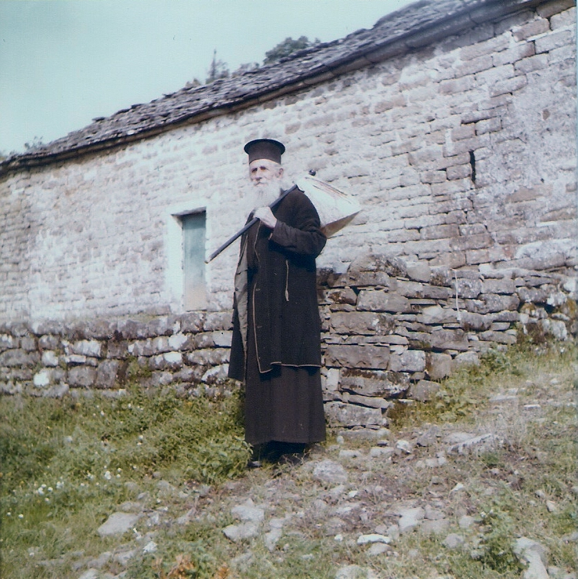 Ὁ παπα-Κώστας ἔξω ἀπό τήν Ἁγία Παρασκευή, ναΐσκο τῶν Πιστιανῶν τοῦ 17ου αἰώνα. Μεταφέρει στόν μπόγο τά ἀπαραίτητα, ἄμφια καί βιβλία, γιά τήν ἀκολουθία πού τέλεσε. (Ἀρχές δεκαετίας τοῦ 1980, φωτογραφία Εὐαγγέλου Γ. Κόκκινου).