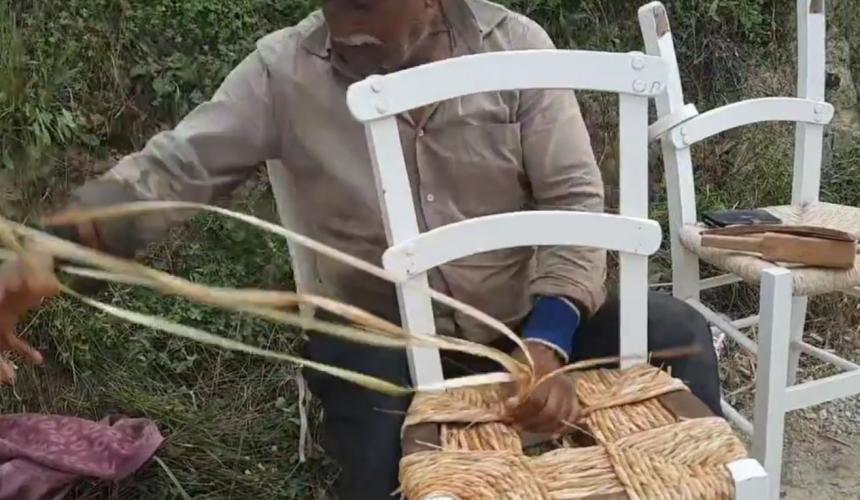 Με ταχυδακτυλουργικες κινήσεις έδινε στο κουφάρι της καρέκλας ζωή. Η μια ψάθινη, η άλλη από πλαστικό. Μεγάλη μαστοριά και δεν του έπαιρνε πολλή ώρα.