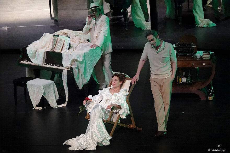 Εκεί, στο ίδιο σαλόνι, στο τρίτο επίπεδο της παράστασης, λες και είναι αόρατα, εκτός από τα τέσσερα πρόσωπα, κινούνται άλλα δύο, αέρινα δοσμένα στον χορό του έρωτά τους. Είναι το τρίτο επίπεδο του χρόνου. Δεν μιλούν, είναι απλώς η ζωντανή ανάμνηση του τότε, αυτό που νοσταλγεί με όλη της την ψυχή η Άλμα που το όνομά της είναι ψυχή.