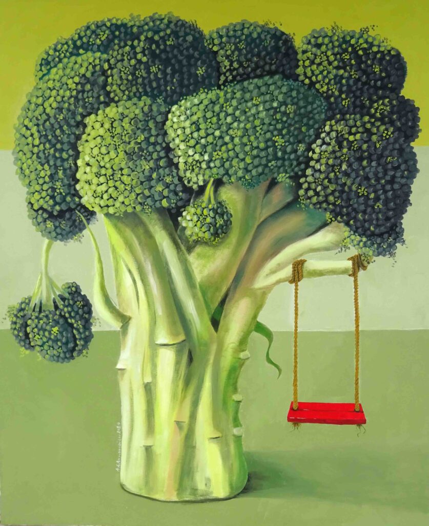 Η επόμενη φάση είναι τα αβγά. Πολλά αβγά, όμως ένα έχει σπάσει και σπαταλά τον υπέροχό κρόκο του μαζί με το ασπράδι πάνω στα άλλα άσπρα αβγά, σαν να θέλει να τα γονιμοποιήσει. Χαμένη πάει η ομελέτα. Εντάξει, δεν θα φάμε ούτε κόκορα ούτε αβγό. Ένα περίλαμπρο μπρόκολο όμως με πολύκλωνο κορμό, ντούρο σαν πολύχρονη ελιά, στέκει εκεί με τις θαλερές καταπράσινες φούντες του. Είπα μπρόκολο αλλά μοιάζει σαν μπιζελομπροκολόδεντρο. Τέλος πάντων είναι τόσο γερό, μάλλον δεν μασιέται, γιατί δεν είναι για τα δόντια των φτωχών, γιατί δεν αντέχει το μικρό καλάθι τους, αντιθέτως. αντέχει μια μικρούλα κούνια στα κλαδιά του να λικνίζει ένα παιδάκι· κούνια, μπέλα, έσπασ’ η σκουτέλα και χύθηκε το γάλα (γι’ αυτό δεν έχει τι να πιει…).
