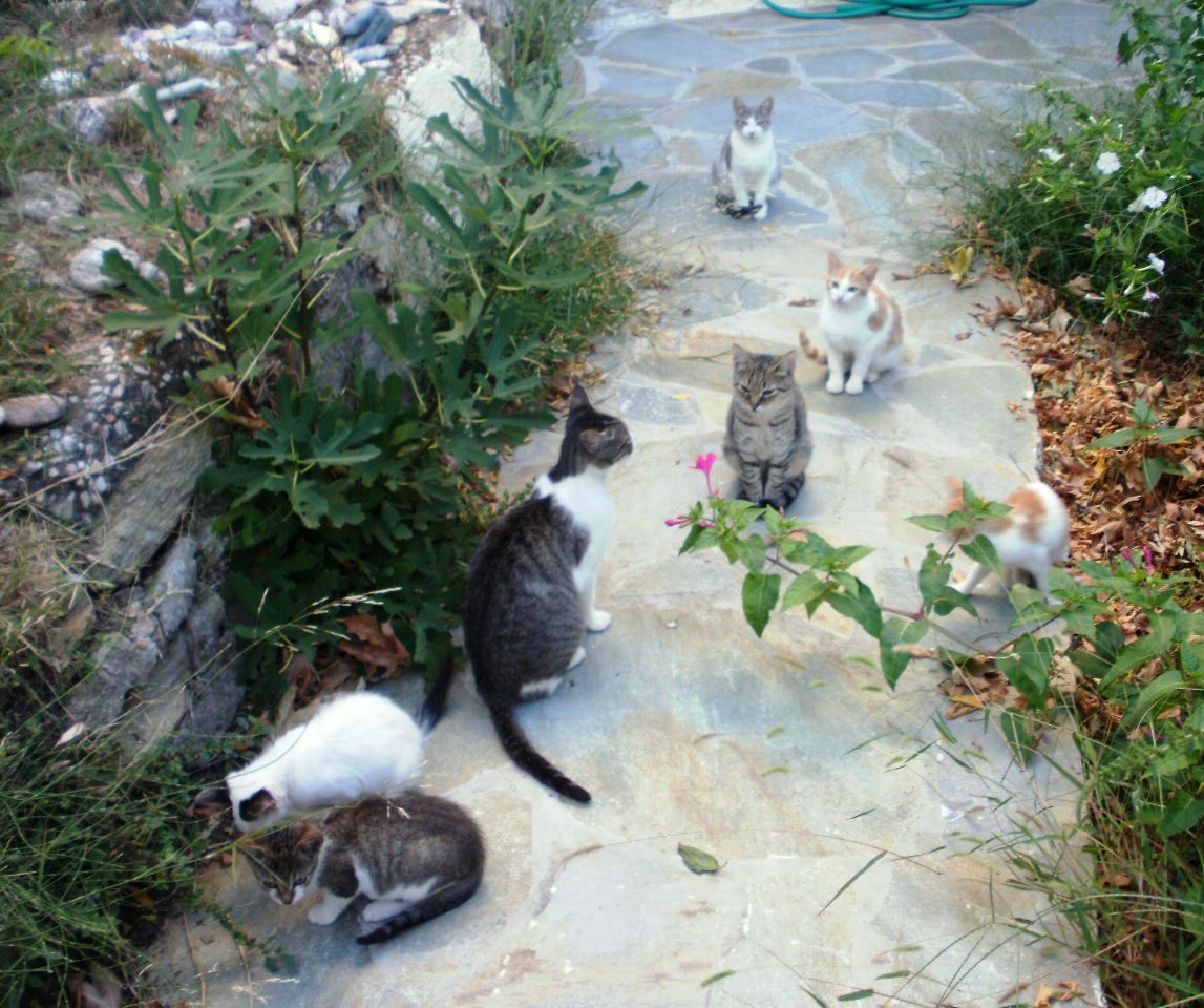 Και που λέτε, όλα τα παράξενα εδώ συμβαίνουν. Στη βεράντα μαζεύονται οι γατούλες μια οικογένειας άστεγης και πεινασμένης. Κι εγώ τις ταΐζω, τις ποτίζω και κάπου κάπου κάνω την κίνηση να τις χαϊδέψω, αλλά αυτές οπισθοχωρούν βίαια. Από τα χρώματα, κυριαρχούν οι ασπρόμαυρες ή μαυρόασπρες, ανάλογα με το υπερέχον άσπρο ή μαύρο στη ράχη τους, αλλά και από το μέγεθος καταλαβαίνω ποια είναι η μάνα και ποια τα παιδιά που συνεχώς την αρμέγουν, άλλωστε. Η όμορφη και πιο μεγαλωμένη πρέπει να είναι ο γάτος. Έρχεται και μια ξανθιά, ωραία και αυτή, αλλά δεν γνωρίζω ποια μπορεί να είναι τα συγγενικά της. Έρχονται, επίσης, αλλά τηρούν τις νόμιμες αποστάσεις, και δυο γκρίζες…