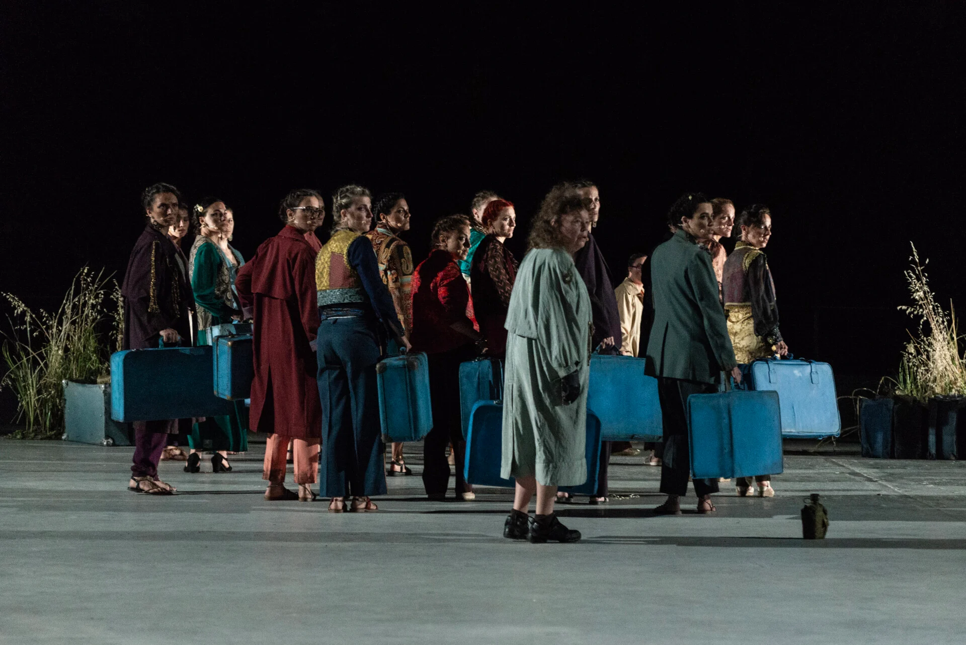 Και τα κοστούμια; Τα πρώτα είναι ομοιόμορφα πένθιμα (;) μήπως είναι ο λαός των γυναικών της Τροίας; Τα άλλα τα χρωματιστά -καμπαρντίνες και σακκάκια σε ωραία φωτεινά κόκκινα, ροζ, τυρκουάζ, που φορούσαν όλοι αυτοί οι «δυστυχισμένοι», εκτός εκείνου του μαύρου ράσου που δεν το φορούσε δυστυχισμένος, και όλοι ήταν σαν «πάμε εκδρομή!». Τι νύφη η μία, τι έξωμο η άλλη (τραγωδία παίζουν μην το ξεχνάμε).