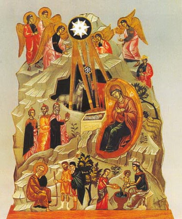 Όλο το τοπίο φωτίζεται από ένα χρυσίζον φως. Δίπλα στη φάτνη βρίσκεται η Παναγία, που έχει τις μεγαλύτερες διαστάσεις σε σύγκριση με τα άλλα πρόσωπα, πράγμα που σχετίζεται μάλλον με τον πρωταρχικό ρόλο της ως Θεοτόκου. Πάνω από το βραχώδες σπήλαιο υπάρχουν, αριστερά και δεξιά τέσσερις συνήθως άγγελοι, που φέρνουν τη χαρμόσυνη είδηση στους ποιμένες. Η παράσταση συμπληρώνεται με τους τρεις Μάγους, άλλες σεβάσμιες μορφές και το λουτρό για το νεογέννητο βρέφος.