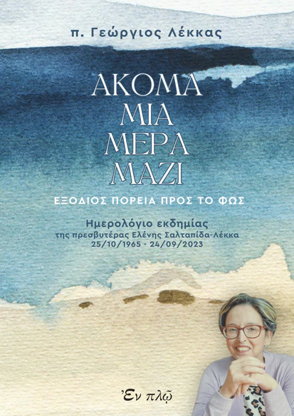 Υπάρχουν κάποια βιβλία που δεν σε καλούν απλώς να τα παρακολουθήσεις, να ταξιδέψεις μαζί τους, να τα απολαύσεις ή να στοχαστείς, αλλά σε συνεπαίρνουν αλλιώς, κινητοποιούν σκέψη και συναίσθημα και τελικά σε αλλοιώνουν εσωτερικά. Ένα βιβλίο αυτής της κατηγορίας είναι το ολίγων σελίδων (σ.79) και μικρού μεγέθους βιβλίο με τον τίτλο Ακόμα μια μέρα μαζί, Εξόδιος πορεία προς το Φως. Όπως δηλώνεται και στο εξώφυλλο πρόκειται για «Ημερολόγιο εκδημίας» που εκτείνεται χρονικά από την 1η μέχρι την 24η Σεπτεμβρίου 2023 και περιέχει καταγραφές συμβάντων, αντιδράσεων και συναισθημάτων δεκαεπτά μόνο ημερών με κύριο πρόσωπο την σύζυγο του συγγραφέα, μια νέα γυναίκα, επιστήμονα, δραστήρια και δημιουργική που βρέθηκε αντιμέτωπη με τη βεβαιότητα του επερχόμενου θανάτου της. Πολέμησε με τα μέσα της επιστήμης να τον αποφύγει, αλλά εκείνος αποδείχτηκε για άλλη μια φορά άτεγκτος, άσπλαχνα σκληρός και αήττητος.
