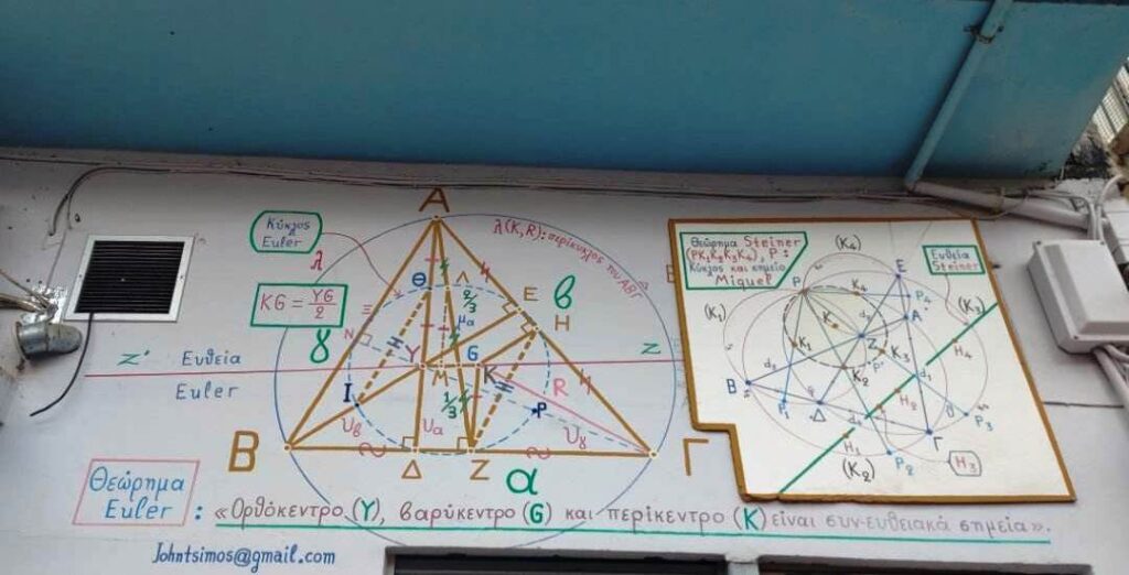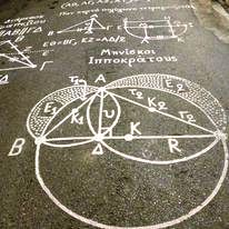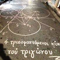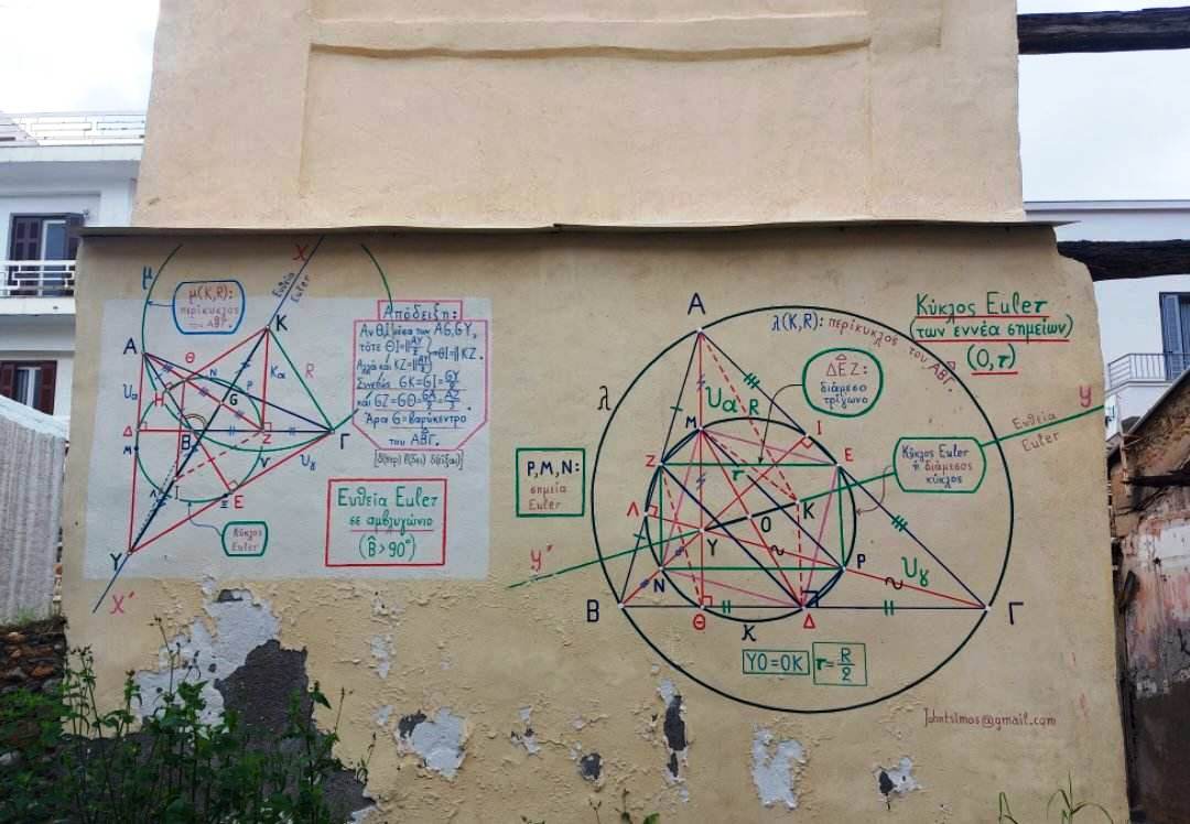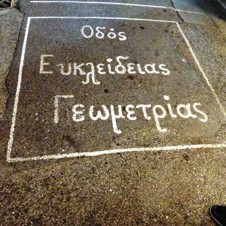 Η συγκεκριμένη εργασία ξεκινάει με την ένδειξη ‘Οδός Ευκλείδειας Γεωμετρίας’ και ακολουθούν στον δρόμο πάμπολλα σχήματα με τις σχετικές εξηγήσεις ή τα αντίστοιχα θεωρήματα. Το ίδιο συμβαίνει και με τοίχους στους δρόμους ή σε σχολεία. Αναρτώνται εδώ φωτογραφίες για του λόγου το αληθές.