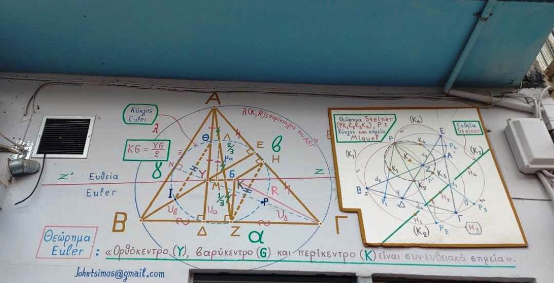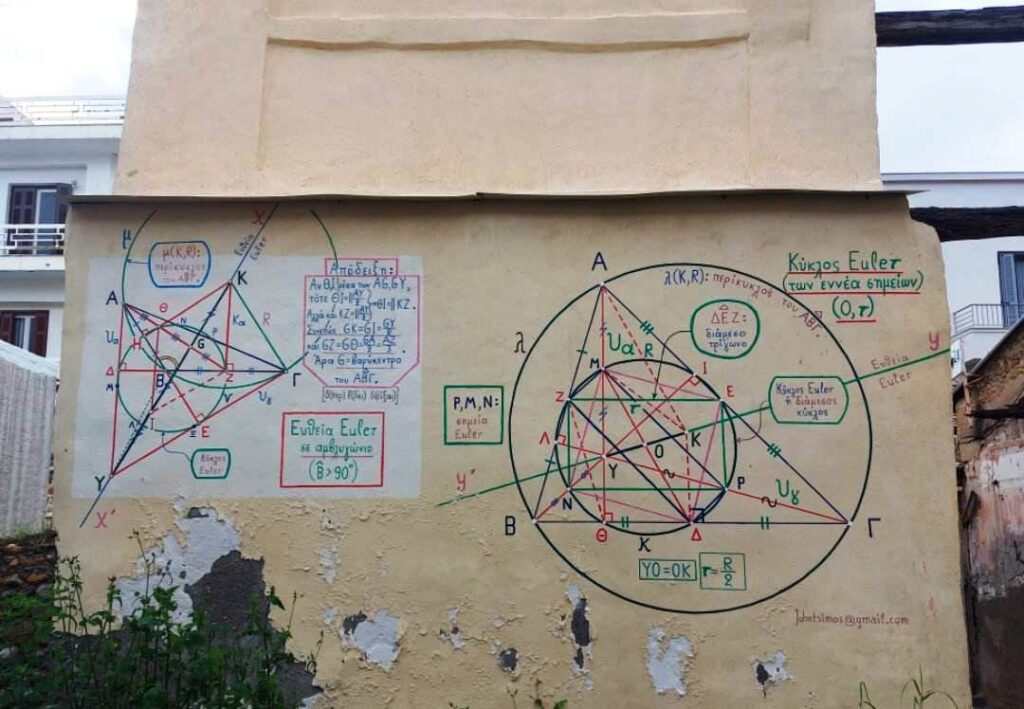Χρόνια πριν, ο γνωστός συνθέτης Θάνος Μικρούτσικος διετέλεσε, στα μέσα των ’90, Υπουργός Πολιτισμού. Την περίοδο εκείνη είχε δηλώσει ότι ψάχνει να βρει τον ‘Ελύτη της Καλαμάτας’. Συνέβη τελευταία να διαβιώ εν Καλάμαις για εργασιακούς λόγους. Δεν βρήκα ακόμη τον ‘Ελύτη της Καλαμάτας’ αλλά ανακάλυψα τον Ευκλείδη της Καλαμάτας –και εξηγούμαι. Σε δρόμους και τοίχους στην παλιά πόλη συναντάει κάποιος σχεδιασμένα/ ζωγραφισμένα (γεωμετρικά) σχήματα της Γεωμετρίας του Ευκλείδη. Αρχικά σκέφτηκα ότι αφού οι ποιητές δεν εμπνέονται στον τόπο μας από τον Ευκλείδη ας εμπνευστεί τουλάχιστον ένας μαθηματικός – γεωμέτρης – καλλιτέχνης και ας ζωγραφίσει στους δρόμους, για το κοινό, κομμάτια της Ευκλείδειας Γεωμετρίας. Όμως απατήθηκα οικτρά γιατί όλη αυτή τη δουλειά την έχει κάνει ένας νομικός και όχι μαθηματικός, ο Γιάννης Τσιμόγιαννης –άλλωστε και ο διάσημος Fermat νομικός ήτανε και όχι μαθηματικός.