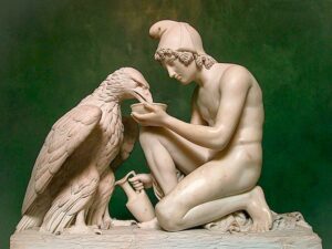 Παραδομένος σε μια δίνη ανάμικτων συναισθημάτων, παραδέρνοντας ανάμεσα στην ευφορία και την αγωνία, ο Δημήτρης προχώρησε στην αίθουσα και επέλεξε να σταθεί μπροστά σε ένα γλυπτό του Γανυμήδη που, όρθιος πλάι σε ένα κορμό δέντρου, τάιζε στο στόμα έναν μεγαλειώδη αετό. Θυμόμαστε ασφαλώς ότι ο αετός, σύμφωνα με τον μύθο, δεν είναι παρά μία ακόμα από τις πολλές μεταμορφώσεις του Δία που πήρε τη μορφή του βασιλέα των πτηνών για να προσεγγίσει ευκολότερα και να αποπλανήσει με τη μορφή αυτή το αντικείμενο του πόθου του. Γνωρίζοντας ίσως, ως θεός που ήταν, ότι η ωραιότης του εν λόγω νεανία ήταν αντιστρόφως ανάλογη με την ευφυΐα του, ο πατέρας των θεών επέλεξε να μεταμορφωθεί στο συγκεκριμένο πτηνό, πιθανολογούμε για να μην τον ανταγωνιστεί με τη διάνοιά του· ιδού μια απόδειξη πραγματικής αγάπης! Στο σημείο αυτό οφείλουμε να πούμε κάτι που θα αποκαθηλώσει μάλλον στα μάτια σας τον βασιλιά των πτηνών. Ορνιθολογικοί κύκλοι διαδίδουν ότι η μνημειώδης εμφάνιση του αετού είναι αντιστρόφως ανάλογη με την ευφυΐα του – όπως και του Γανυμήδη άλλωστε – , με δυο λόγια ο αετός είναι βλακωδέστερος κι απ’ το ταπεινό κοτόπουλο.