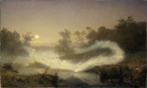 Η μέρα φεύγει. Ξάφνου τον εσπερινό ουρανό σκίζει μια μακρινή αστραπή. Ο κήπος φωτίζεται πέρα ως πέρα. Ταυτόχρονα πυκνή ομίχλη κινείται με τα σαφή όρια ποταμού ανάμεσα σε δέντρα και παγκάκια. Μια οντότητα, «σαν κάτι ζωντανό», μονολογώ. Ο ποταμός της ομίχλης ξεκινάει από τους γαλακτώδεις τοίχους, πηγή του η δική μας άχνα.