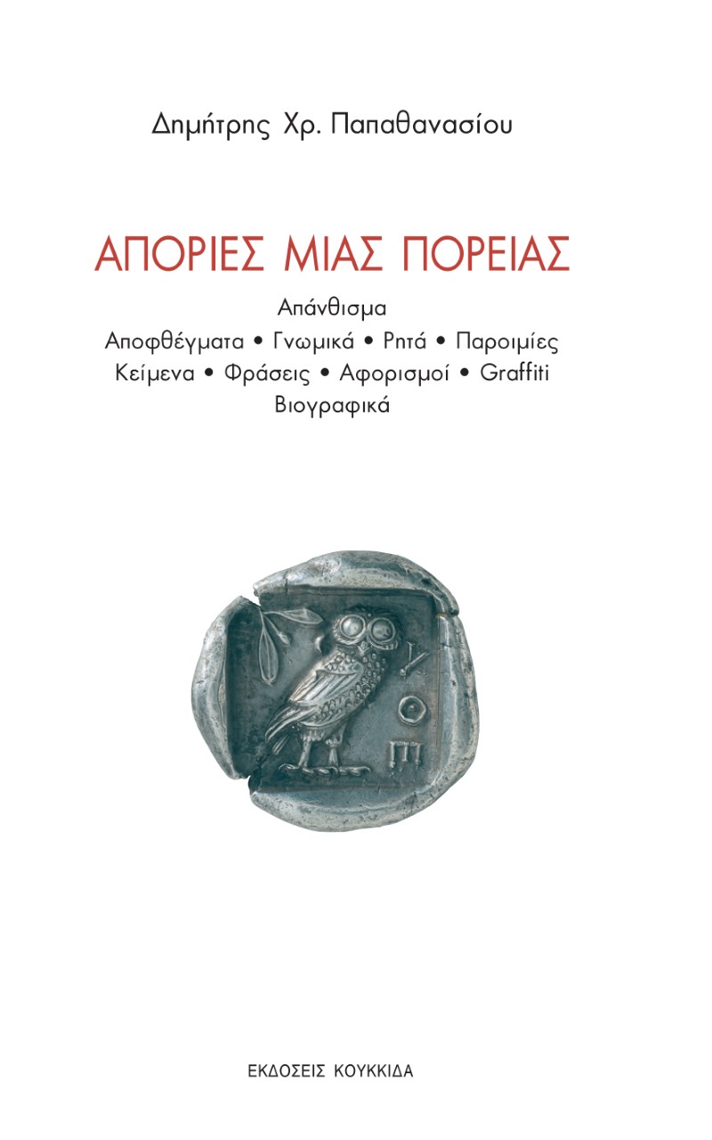 Το πρόσφατο βιβλίο του Δημήτρη Παπαθανασίου συστήνεται με τον παιγνιώδη και ευρηματικό τίτλο Απορίες μιας πορείας ο οποίος, με την παρήχηση που εμπεριέχει, επαναφέρει στην πνευματική ζωή του καιρού και του τόπου το ζήτημα ή, καλύτερα, το ζητούμενο της απορίας ως αιτίας και, ταυτόχρονα, μεθόδου για την αναζήτηση της γνώσης. Πρόκειται για ένα απάνθισμα, μια συλλογή και συμπαράθεση ενός μεγάλου αριθμού από αποφθέγματα, γνωμικά, ρητά και παροιμίες, κείμενα και φράσεις, αφορισμούς, graffiti και βιογραφικά που συνιστούν τη «σοδειά» μιας ζωής, ό τι ο ανθολόγος έκρινε ότι πρέπει να επανακαταγραφεί για να προσφερθεί στον σύγχρονο αναγνώστη ως οδηγός και εγχειρίδιο ζωής. Γιατί αυτή είναι ουσιαστικά η πρόθεση του Παπαθανασίου –να συνθέσει ένα ψηφιδωτό από αποφθέγματα, παραδείγματα και κάθε είδους πολύτιμη πληροφορία και ρήση που ανάγεται και προσλαμβάνει τη μορφή της ανθρωπότητας όπως αυτή εκδήλωσε τη σοφία και τη ροπή της προς τη γνώση, την πρόοδο και την ευημερία μέσα από συγκεκριμένες περιπτώσεις ανθρώπων που τη σφράγισαν ανεξίτηλα.
