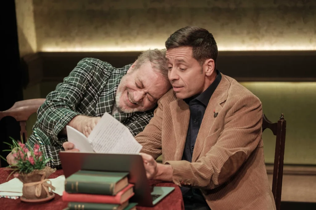 Η σκηνική διασκευή του έργου από τον ΤζέφριΧάτσερ και τον ίδιο τον Άλμπομ είναι μια ακριβής μετάφραση αυτής της σχέσης σε θεατρικό ρυθμό. Το«Κάθε Τρίτη με τον Μόρι», κυκλοφόρησε το 1997 και έγινε παγκόσμιο bestseller, πριν διασκευαστεί και για το θέατρο. Ο Γρηγόρης Βαλτινός λοιπόν επιστρέφει φέτος στον ρόλο του Μόρι υπογράφοντας τη σκηνοθεσία της παράστασης και συναντά στη σκηνή του θεάτρου Ιλίσια Βολανάκης τον Γιάννη Σαρακατσάνη ως αποπροσανατολισμένο Μιτς. Το έργο στηρίζεται σε δύο πρόσωπα και έναν αόρατο τρίτο, τον χρόνο. Η παράσταση, με τον Γρηγόρη Βαλτινό ως Μόρι και τον Γιάννη Σαρακατσάνη ως Μιτς, επιχειρεί να αποδώσει αυτή την αόρατη πάλη ανάμεσα στη φθορά και τη μνήμη. Δεν υπάρχει θεατρικό τέχνασμα που να μην υπηρετεί την απλότητα. Ο χώρος είναι οικείος, σχεδόν σαν το σαλόνι του ίδιου του θεατή. Ένα αναπηρικό καροτσάκι, ένα τραπεζάκι, φωτογραφίες, λίγα βιβλία, και μια αίσθηση ακινησίας που υπογραμμίζει το αναπόδραστο.