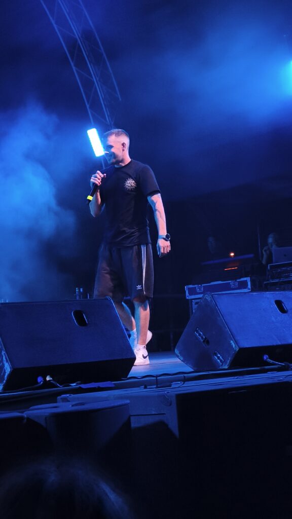 Από το σημείο που βρισκόμουν περισσότερο τον κόσμο μπορούσα να δω παρά τον καλλιτέχνη. Το πλήθος παρασυρόταν από τον ρυθμό των ήχων και των φώτων. Από κάθε πλευρά, άνθρωποι με υψωμένα χέρια, πρόσωπα που φωτίζονταν από φευγαλέες λάμψεις, σώματα που κινούνταν ρυθμικά, σαν να αποτελούσαν όλοι μέρος μιας μεγάλης χορογραφίας. Ο χώρος, που την ημέρα θυμίζει μουσείο και υπενθυμίζει την ιστορία της πόλης, τη νύχτα έγινε ζωντανός οργανισμός, με φωνή, παλμό και ανάσα.