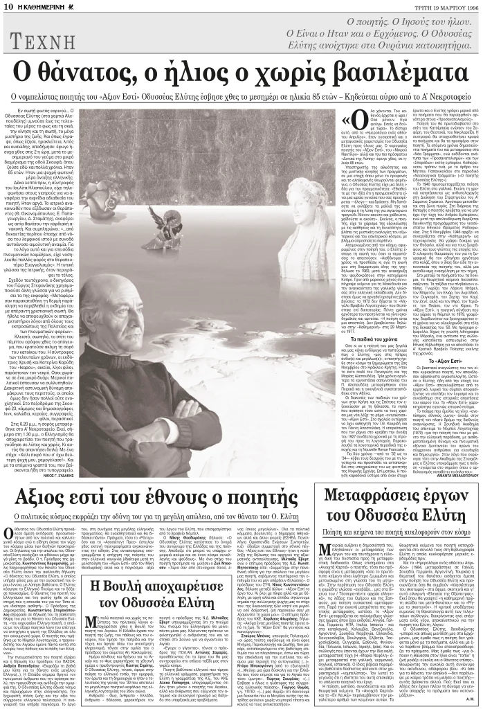 Αυτοί οι στίχοι μού θυμίζουν ένα μεσημέρι στην οδό Σκουφά που είδα τον Ελύτη να περνάει από μπροστά μου. Τόσο ξαφνιάστηκα, όταν διασταυρώθηκαν οι ματιές μας, που σίγουρα το κατάλαβε, γιατί αμέσως φωτίστηκε ευχάριστα το πρόσωπό του. Ήταν η μόνη φορά που είδα τον ίδιο τον Ελύτη και όχι φωτογραφίες του.
