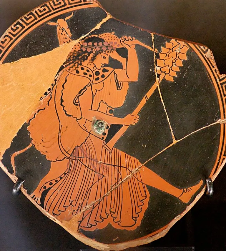 Αυτά, στο βουνό. Κι εδώ κοντά, νά οι Θήβες και το παλάτι του Κάδμου και ο θρήνος για το κυνήγι και οι συγγενείς που συναρμολογούν τον νεκρό, μήπως σωθεί κάτι για να ταφεί. Κείτεται και το κεφάλι του Πενθέα –δίχως αμφιβολία πλέον δικό του– έτσι που τον οικτίρει και ο Διόνυσος· νεότατο, με γένι απαλό και με πυρρόξανθα μαλλιά, που δεν στεφάνωσε κισσός ή σμιλακιά ή αμπελόκλημα και δεν τα έσεισε αυλός κανείς ούτε και οίστρος. Από αυτά έπαιρνε δύναμη και δύναμη τους έδινε, και ήταν τρέλα να μην συμμετέχει στην τρέλα του Διονύσου.