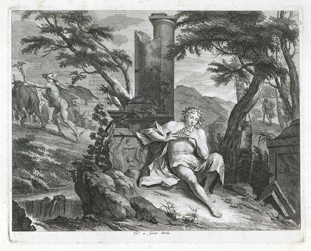 Ο νεαρός Ερμής κλέβει το κοπάδι των βοδιών, και ο Απόλλωνας παίζει με τη σύριγγα. (Γκραβούρα, Philip van Gunst, περ. 1685-1732)