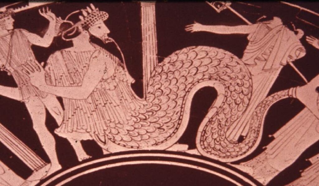 3)Η Σφίγγα είχε μορφή γυναίκας, σώμα και ουρά λιονταριού και μεγάλα φτερά. Για την ΄Εχιδνα βλ. σχ. 6 του άρθρου μας με μεταφρασμένο απόσπασμα από τους  Βατράχους του Αριστοφάνη (19/3/2022).