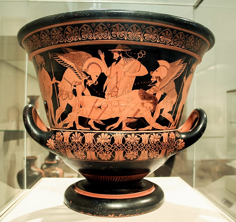 Η εμπρόσθια όψη του περίφημου αριστουργηματικού κρατήρα του αγγειογράφου Ευφρονίου (περ. 510 π. Χ.). Παριστάνονται ο Υπνος και ο Θάνατος να μεταφέρουν το σώμα του νεκρού Σαρπηδόνα (σχ. 6)
