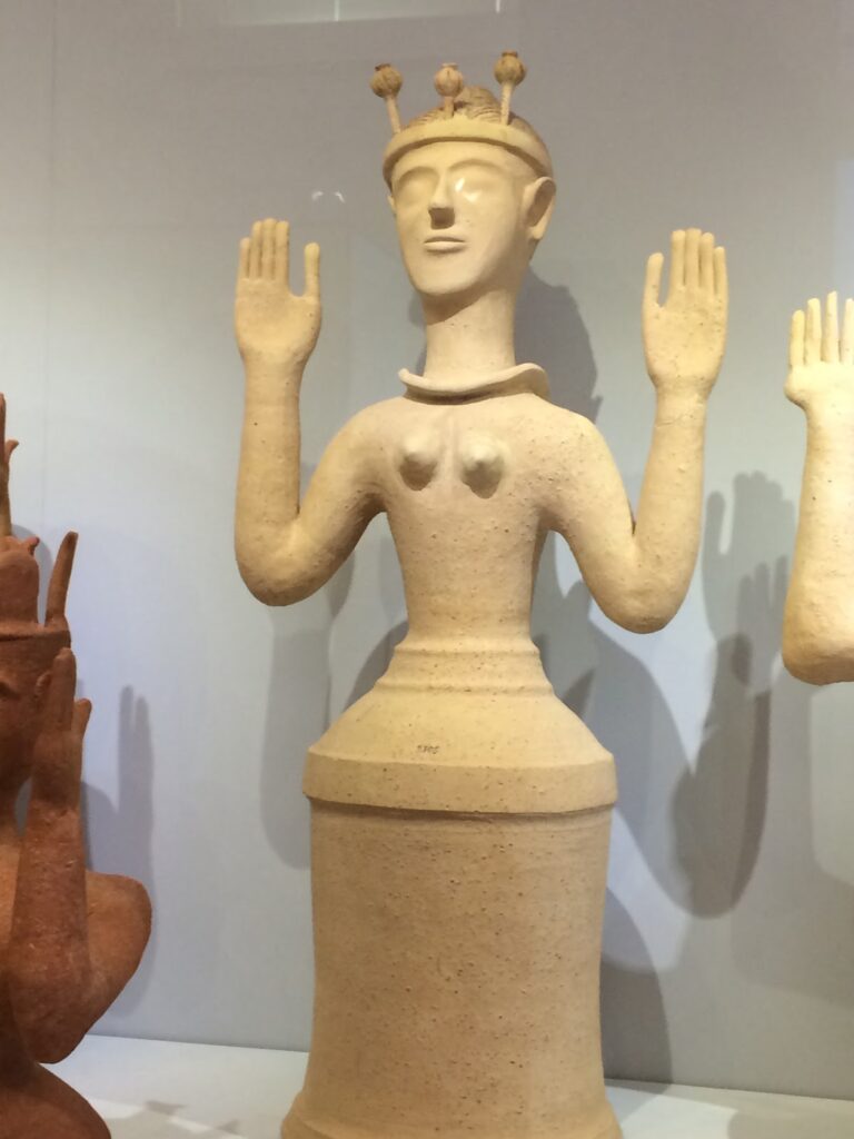 Μινωϊκό πήλινο ειδώλιο γνωστό ως ” Θεά των μηκώνων” από τα ομοιώματα καρπών της παπαρούνας που φέρει στο κεφάλι. (1350-1100 π. Χ.)