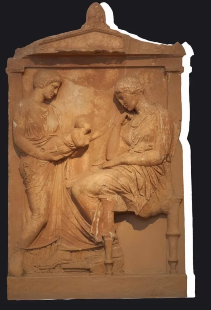 Η επιτύμβια στήλη τής Φιλονόης (περ. 370-360 π. Χ.). Η νεκρή Φιλονόη καθιστή έχει μπροστά της την παραμάνα με το παιδί της Φιλονόης που άφησε πίσω της πεθαίνοντας.