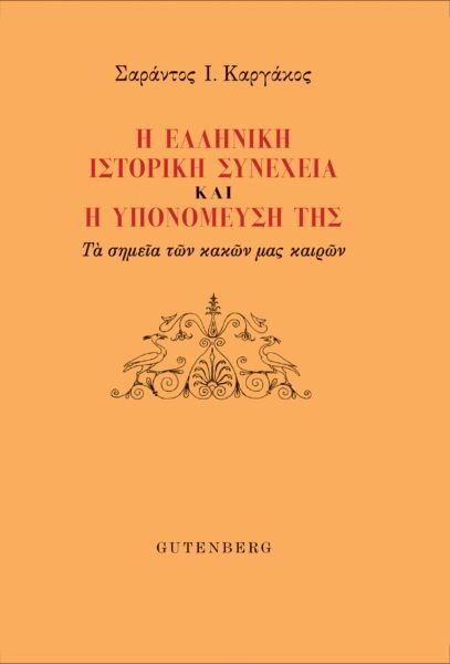 Το πρόσφατο πόνημα του εκλιπόντα μα όχι απόντα Σαράντου Ι. Καργάκου, «Η ελληνική ιστορική συνέχεια και η υπονόμευσή της» από τις εκδόσεις Gutenberg, αποθησαυρίζει τους τρόπους εκείνους που ο ελληνικός κόσμος κατέστη απέθαντος δίχως όμως να μεροληπτεί ωραιοποιώντας ή αποκρύπτοντας γεγονότα, αστοχίες και σκοπιμότητες που κλόνισαν ή εξακολουθούν αν κλονίζουν την πορεία ετούτη.