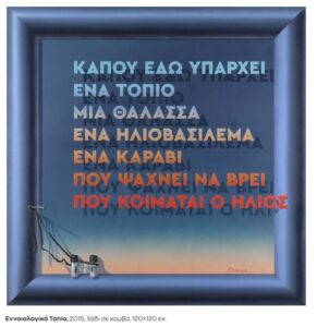 Αποκορύφωση αυτής της εννοιολογικής κατεύθυνσης είναι το Εννοιολογικό Τοπίο (2023),όπου το τοπίο ζωγραφίζεται ως τόπος σκέψης. Οι λέξεις δεν αντικαθιστούν την εικόνα, αλλά ενεργοποιούν την εμπειρία και την προσδοκία πριν αυτή γίνει ορατή. Η φράση «κάπου εδώ υπάρχει» είναι άμεση πρόκληση στο βλέμμα, ενώ το «καράβι που ψάχνει να βρει πού κοιμάται ο ήλιος» γίνεται μια αλληγορία της ανθρώπινης αναζήτησης νοήματος. Έτσι, ο πίνακας μετατρέπεται από παράθυρο στη φύση σε πλαίσιο σκέψης, εκπαιδεύοντας το βλέμμα να μην καταναλώνει εικόνες, αλλά να τις ερμηνεύει.[ii]