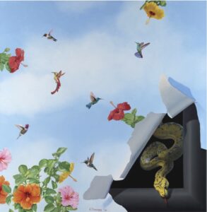 In his recent work The Dark Side of Paradise (2026), the painted “tear” in a landscape of sky, hummingbirds, and flowers reveals a dark interior space in which a yellow arboreal python appears. Beauty remains, but becomes fragile in the face of a latent threat.