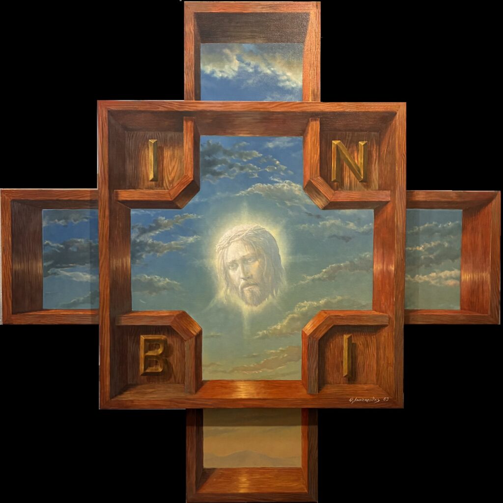 In Leontaridis’s work, the cross does not function as a straightforward reiteration of a religious image; instead, it becomes a symbolic device that lends existential density to the human figure and underscores the tension between mortality and transcendence. At the centre shines the luminous face of Christ, set against a celestial landscape of clouds and tranquil light. Gentleness, compassion, and spiritual serenity coalesce into a vision of redemptive divine presence.
