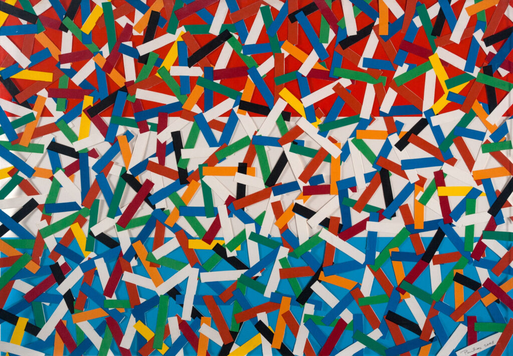 Over the course of six decades, Pavlos maintained an unwavering commitment to colored paper as the primary medium for his works. Far from seeing it as a ready-made material, he embraced it as a “tool of a visual myth”, a concept articulated by Pierre Restany. Discerning in Pavlos a mixture of Matisse’s ingenuity and a tailor’s skill, Restany recognized the artist’s ability to transcend traditional uses of paper.