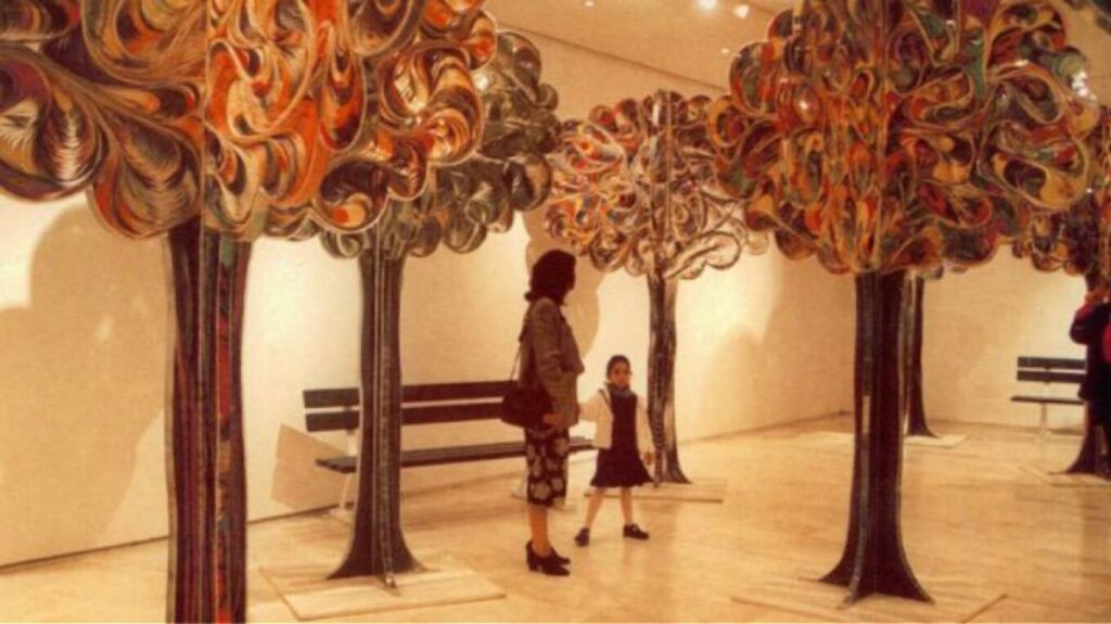 The sound-insulating and heat-insulating acrylic glass, although manufactured since 1928 and introduced to the market in 1993 as plexiglass, allowed Pavlos to move away from the wall and into the space. In 1968 at Illeana Sonnabend’s gallery he presented the first environment, exhibiting three-meter paper columns surrounded by cylindrical plexiglass that were considered a modern version of the ribbed column of antiquity and three-meter red paper curtains also in parallelogram plexiglass boxes that stood in the space. Two years later, evolving the patterning of plexiglass, he created the environment “Forest, 26 trees from A to Z” (1970-71) with trimetric colorful paper trees that he first presented at the Grand Palais (Paris, 1972) and with which he put the viewer inside the work as he walked among the trees and sat on the bench beneath the works, as he used to say. From then on, Nature, with its trees and sea, became part of his subject matter. In the series ‘Landscapes and Stormy Seascapes’ (1988), ‘Cypresses’ (1990) Pavlos worked with the gaze and psychology of an impressionist painter. He depicted the fleeting impressions of the moment using papery polychromy as if it were the impressionists’ colorful palette to illuminate the fleeting moment through the intense combinations of hues.