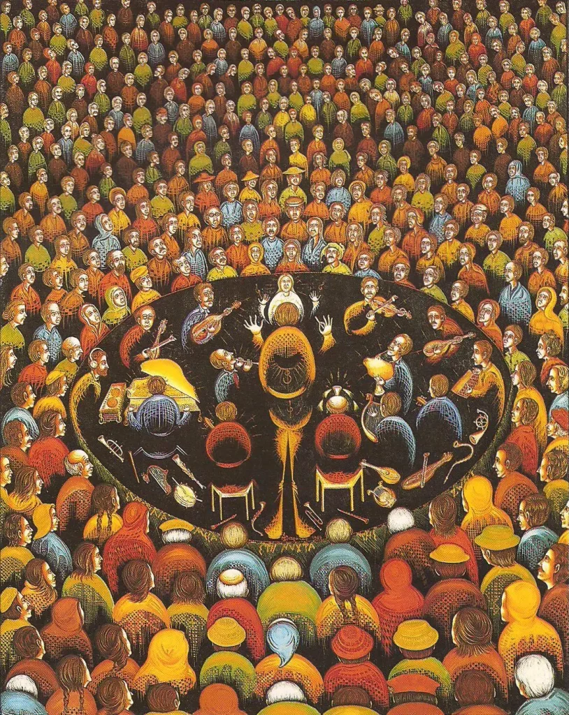 Τέτοια συνθετικά στοιχεία της εικόνας που τη μετατρέπουν σε ‘πίνακα-Σύμπαν’ προσφέρουν  πλήθος ερμηνειών. Σε αντίθεση με τους αυστηρούς θεολογικούς συμβολισμούς, τα σύμβολα του Μητράκα είναι βαθιά ανθρώπινα. Με την πεποίθηση ότι ο άνθρωπος εξελίσσεται μέσω της γνώσης, της εργασίας και της μουσικής, η προσέγγισή του Μητράκα δεν είναι διδακτική με την παραδοσιακή έννοια αλλά πατρική στην ευγενική καθοδήγησή της προς την κατανόηση της ουσίας της ανθρώπινης εμπειρίας. Μέσα από τη ζωγραφική του, απομακρύνεται από τον βυζαντινό σχολαστικισμό, υιοθετώντας μια ανθρωπιστική λαϊκή ευαισθησία που εξυμνεί την ποικιλομορφία και τη ρευστότητα της πραγματικότητας ώστε οι πίνακές του να λειτουργούν ως πύλες σε μια υπερπραγματικότητα.