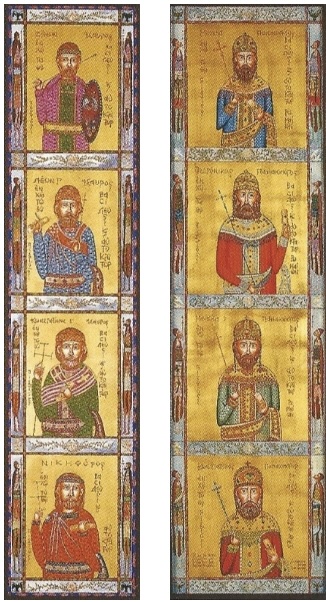 Ακόμη και στη σειρά αφιερωμένη στους Βυζαντινούς Αυτοκράτορες (1996-1999), εστιάζοντας στη Δυναστεία των Παλαιολόγων, των Μακεδόνων και των Ισαύρων, παρόλη την πολυτελή τους εμφάνιση και τη σχεδόν ιερατική τους μεγαλοπρέπεια, ζωγραφισμένοι σε επιμήκεις σανίδες και τοποθετημένοι σε μεμονωμένα τετράγωνα, τα πορτραίτα τους προκαλούν μια αίσθηση κινηματογραφικής αφήγησης που μοιάζει απτή και απόκοσμη.