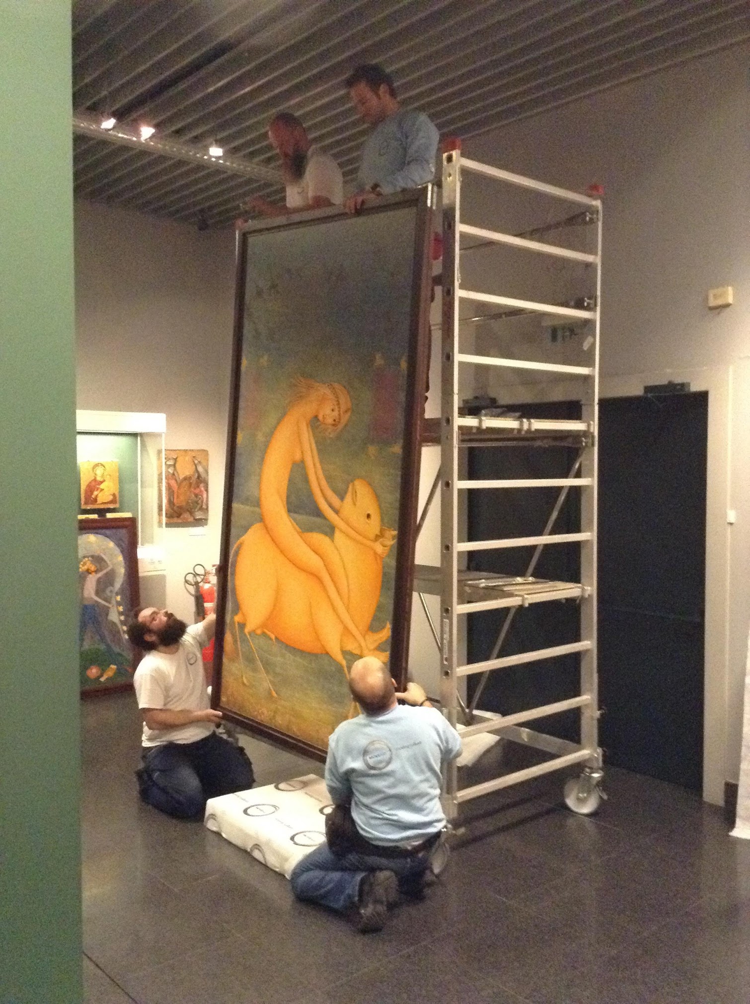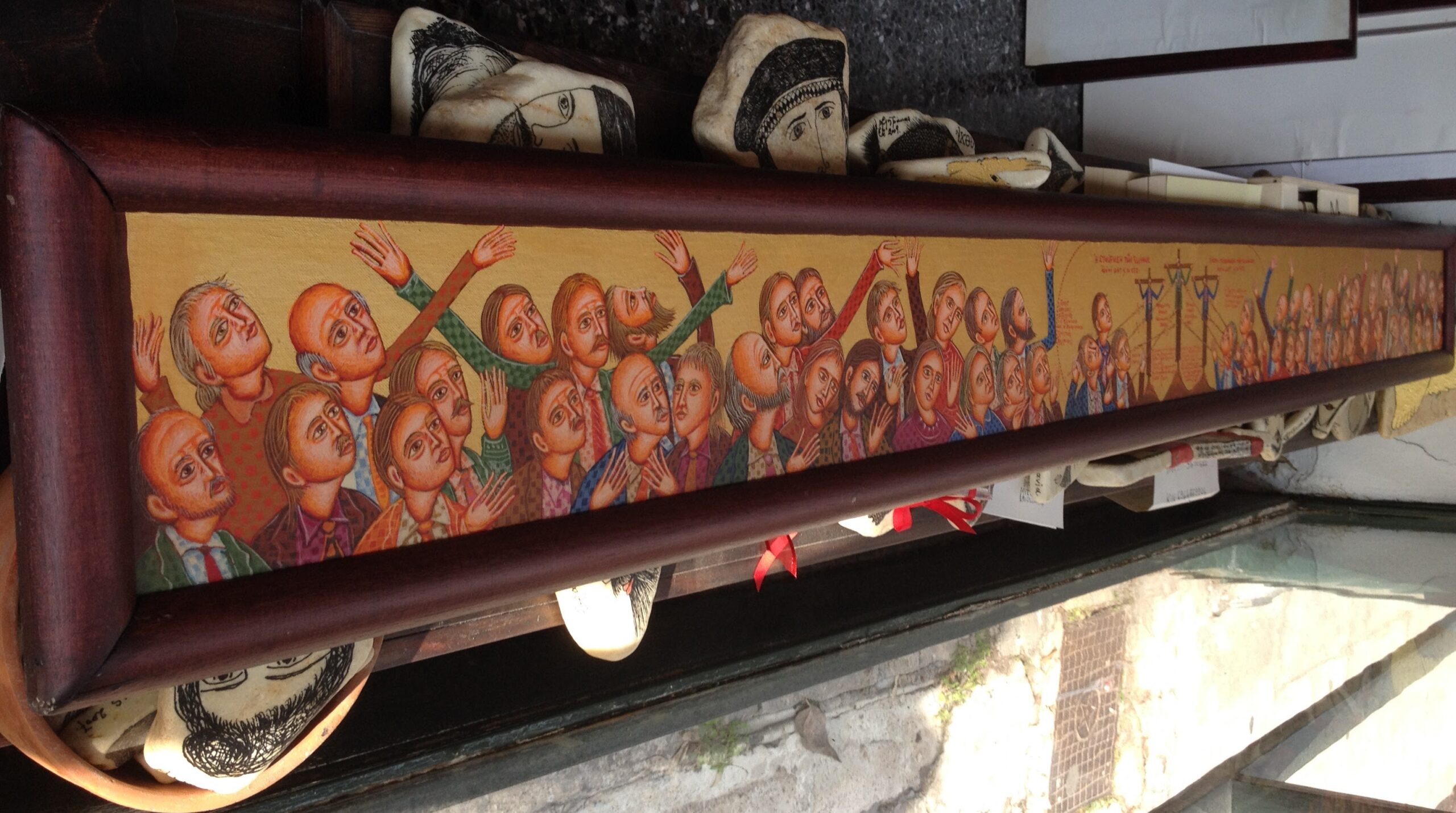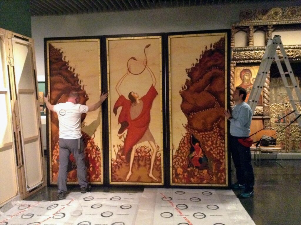 Τα έργα του Μητράκα κυριολεκτικά ‘ουρανοκατέβαιναν’ στο χώρο, αφού όλα ήταν κρεμασμένα από την οροφή, υπαρκτά σ’ έναν ανοιχτό διάλογο μορφών, θεματογραφίας, αισθητικής και περιεχομένου, ώστε να είναι εμφανής η λεπτή ισορροπία εντυπώσεων, ανάμεσα στη βυζαντινή στερεότητα και τις αιωρούμενες ζωγραφιές του καλλιτέχνη, ανάμεσα στην παγιωμένη ιστορία και το αενάως μεταβαλλόμενο παρόν.