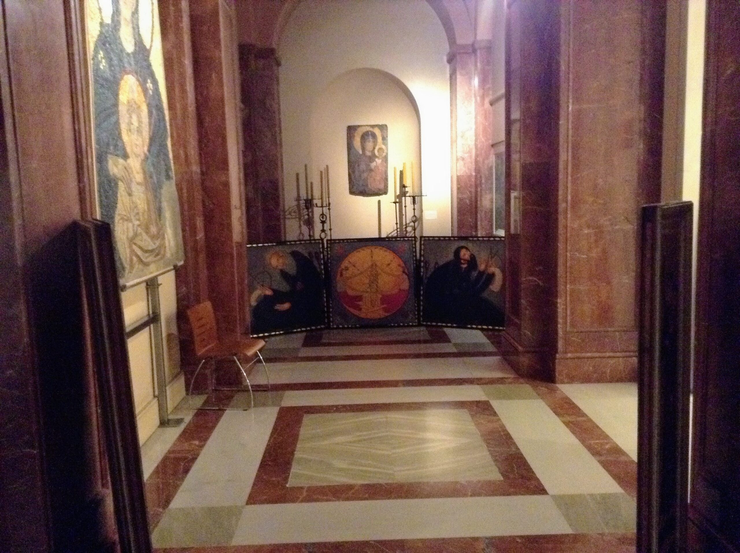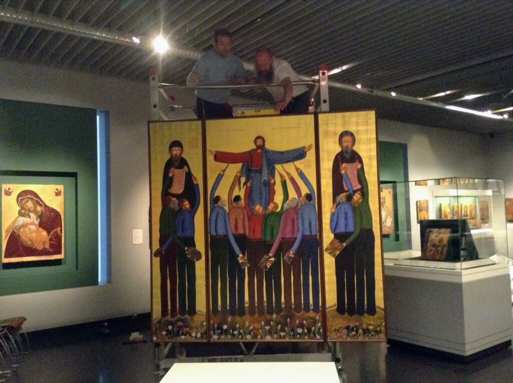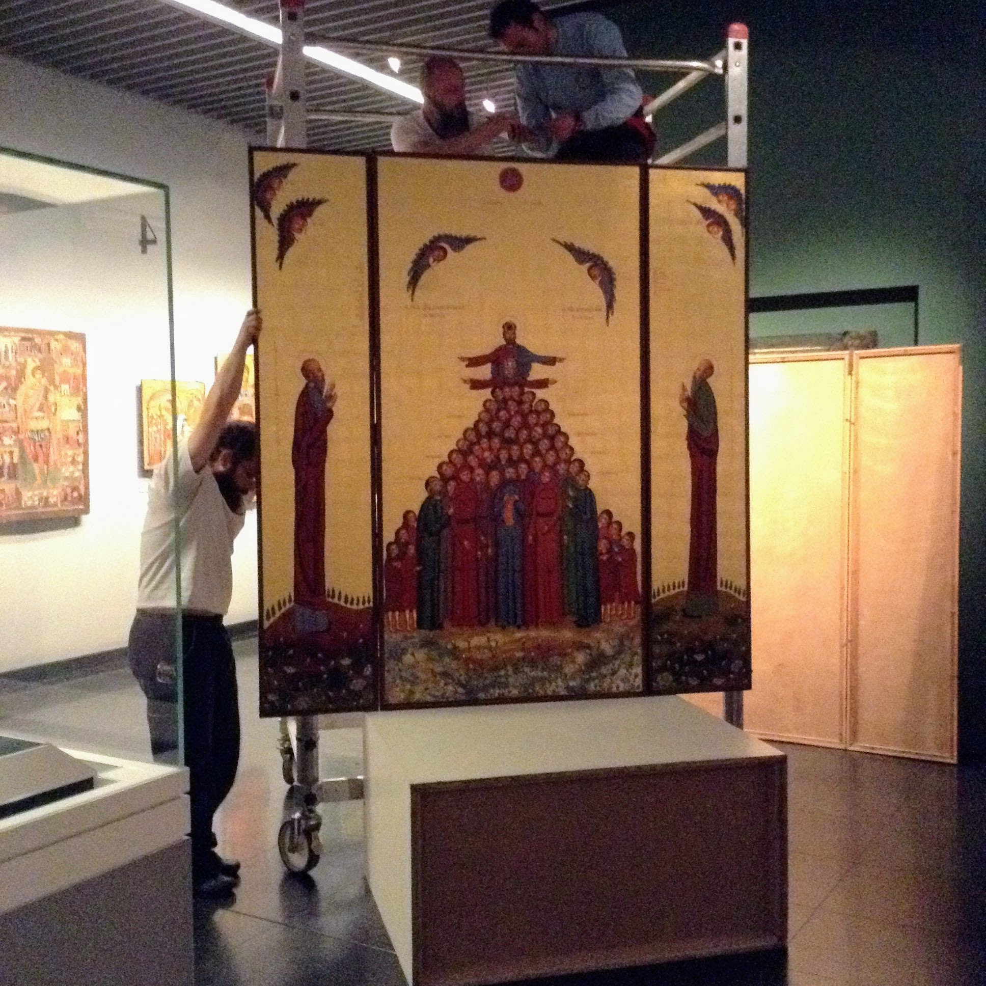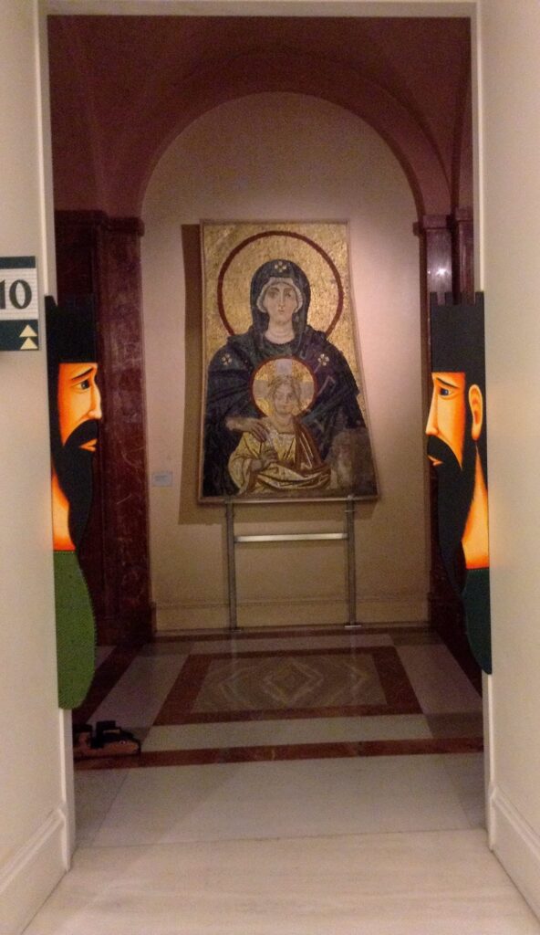 Τα έργα του Μητράκα κυριολεκτικά ‘ουρανοκατέβαιναν’ στο χώρο, αφού όλα ήταν κρεμασμένα από την οροφή, υπαρκτά σ’ έναν ανοιχτό διάλογο μορφών, θεματογραφίας, αισθητικής και περιεχομένου, ώστε να είναι εμφανής η λεπτή ισορροπία εντυπώσεων, ανάμεσα στη βυζαντινή στερεότητα και τις αιωρούμενες ζωγραφιές του καλλιτέχνη, ανάμεσα στην παγιωμένη ιστορία και το αενάως μεταβαλλόμενο παρόν.