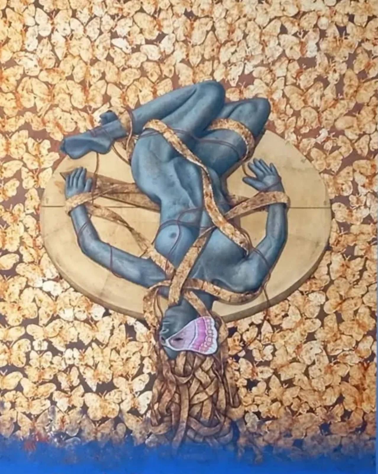 Αγγελίδης Πασχάλης, The Butterfly woman’s game (λάδι σε μουσαμά  100×80 εκ.) Σκηνοθετημένη αλληγορία, με το σώμα να γίνεται πεδίο μεταμόρφωσης.
