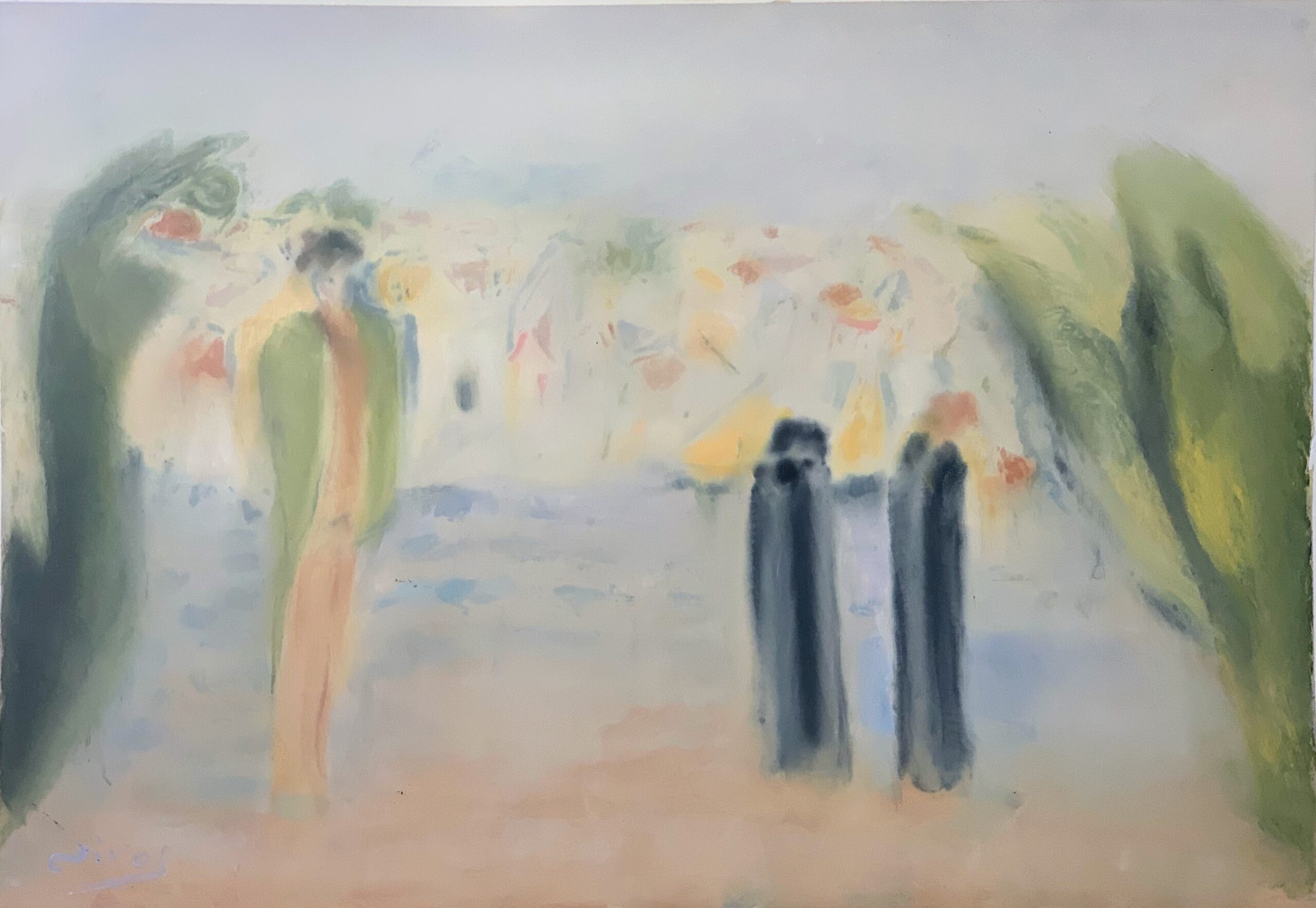 Κυπραίος Νίκος, Έρωτας στο Παζάρι (2023 λάδι σε χαρτί 70×100 cm) Μορφές που σβήνουν στο χώρο ως η αίσθηση του έρωτα στο δημόσιο χώρο.