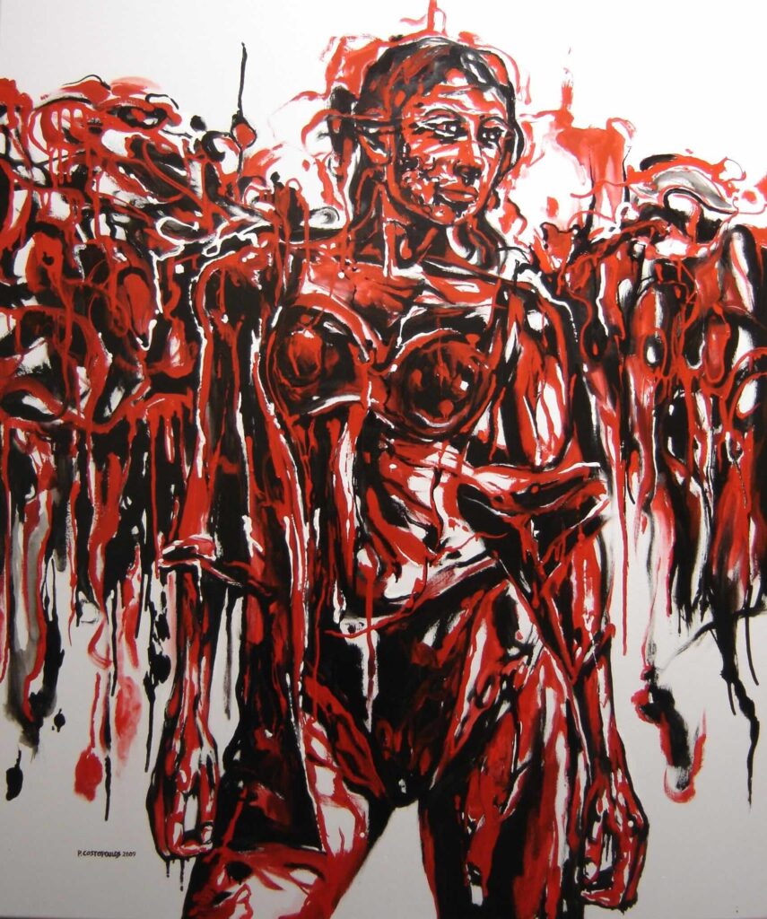 Ονειρικές και υπαινικτικές είναι οι μορφές του Νίκου Κυπραίου στο «Έρωτας στο Παζάρι», καθώς σβήνουν μέσα σε χρωματικές μάζες και φωτεινά ίχνη. Δεν πρόκειται για ένα ρεαλιστικό επεισόδιο ή ένα συμβάν, αλλά για μια αίσθηση που γεννιέται από τη συνάντηση ανάμεσα σε βλέμματα και κινήσεις στον δημόσιο χώρο. Αν στον Καρά η μορφή είναι ιδεαλιστική και στον Κυπραίο ένα ατμοσφαιρικό συμβάν, στον Περικλή Κωστόπουλο η γυναικεία μορφή εμφανίζεται δυναμική, έντονη, επικίνδυνη. Ο τίτλος «Πολεμίστρια του Φωτός» (2009) σε συνδυασμό με τη μετωπική στάση και τις έντονες ροές κόκκινου και μαύρου, μετατρέπει το σώμα σε πεδίο σύγκρουσης ανάμεσα στην αποκάλυψη και τη σκληρότητα. Το βλέμμα δεν θαυμάζει. Καθηλώνεται, μετρώντας τα ρίσκα κάθε πράξης διεκδίκησης.