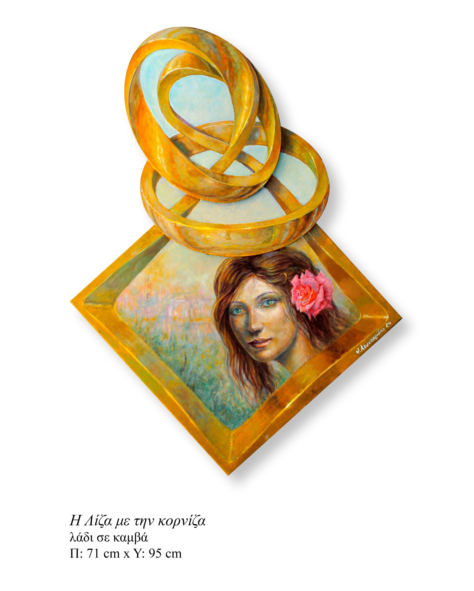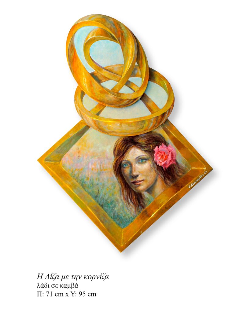 Στο έργο του Θανάση Λεονταρίδη, «Λίζα με την κορνίζα», η μορφή παρουσιάζεται μαζί με τον ίδιο τον μηχανισμό που τη μετατρέπει σε εικόνα. Η κορνίζα δεν είναι ένα ουδέτερο περίγραμμα, αλλά ενεργό στοιχείο της σύνθεσης που πλαισιώνει, προβάλλει και οργανώνει το βλέμμα. Οι ξύλινες κυκλικές ταινίες, σαν επίστεψη, επεκτείνουν το πλαίσιο και εντείνουν την αίσθηση ότι η θέαση δεν είναι «φυσική» αλλά κατασκευασμένη, όπως συχνά κατασκευάζεται και η εικόνα της γυναίκας. Έτσι, η Λίζα δεν είναι μόνο πρόσωπο, αλλά μια εικόνα που δηλώνει το πλαίσιό της και τους όρους της θέασης.