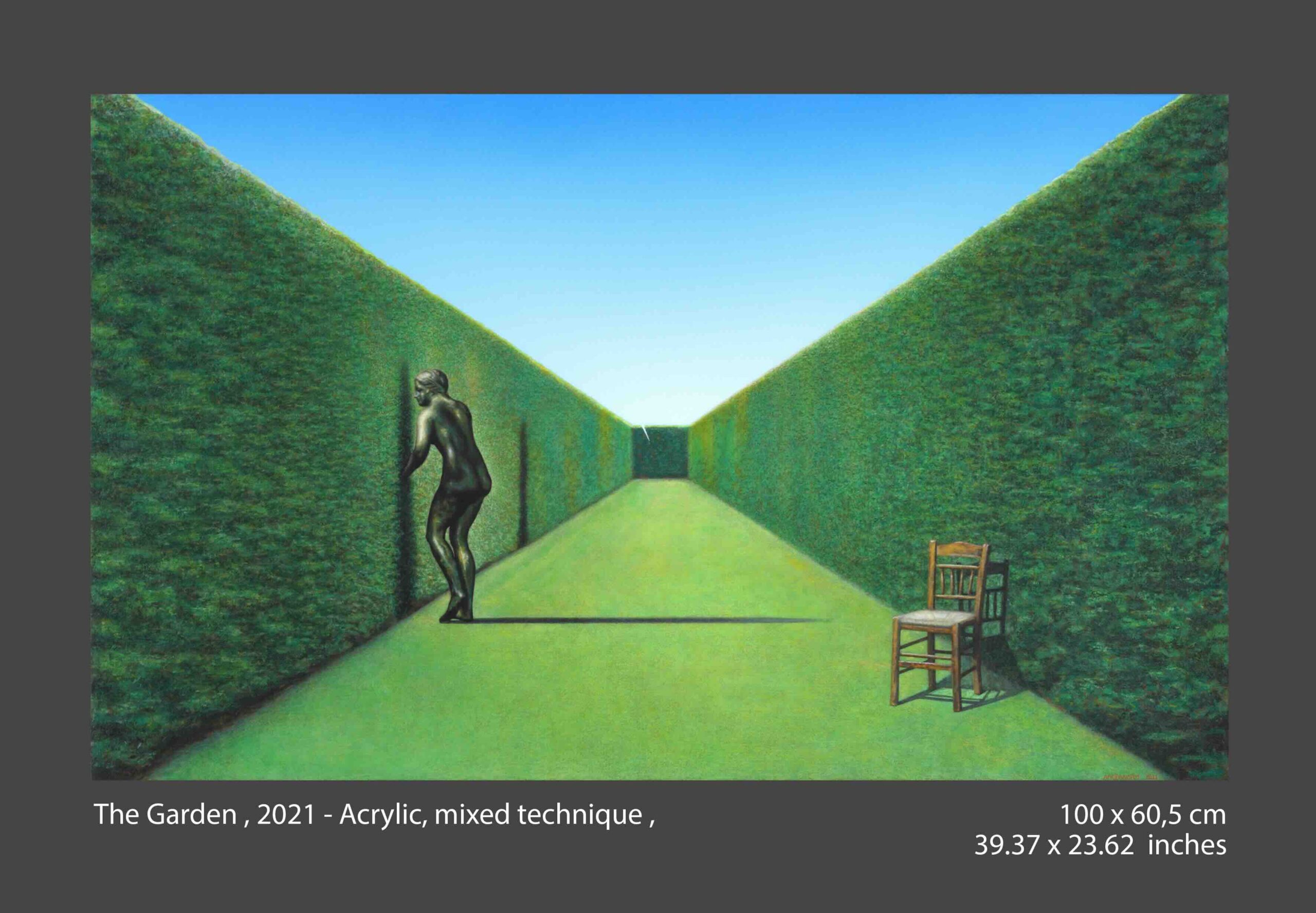Μουστάκας Αλέξανδρος, Ο Κήπος (2021, Ακρυλικά́, μικτή́ τεχνική́ 100×60,5 εκ.) Ο λαβύρινθος ορίζει τους κανόνες και η αγαλμάτινη μορφή την αδύνατη φυγή.