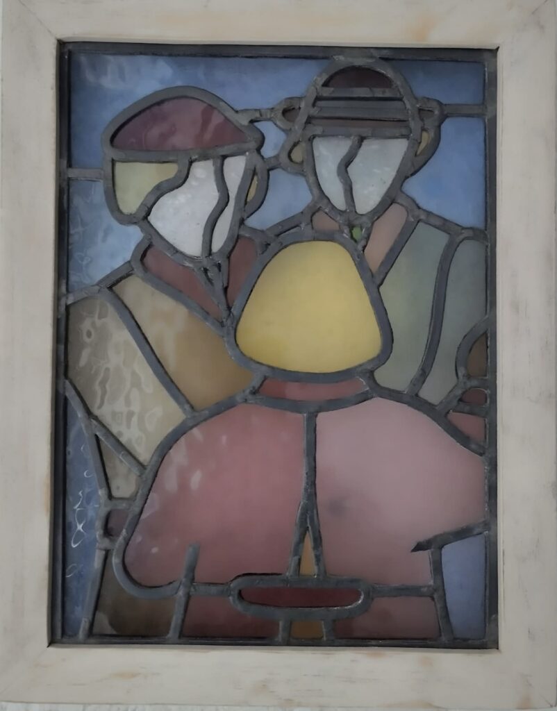 Μπουζιούκος Γιάννος, Παρέα με Γυναίκες (βιτρό́, γυαλί́, μολύβι 41×32 cm) το κοινωνικό βλέμμα τεμαχίζει τη συνύπαρξη σε ρόλους.