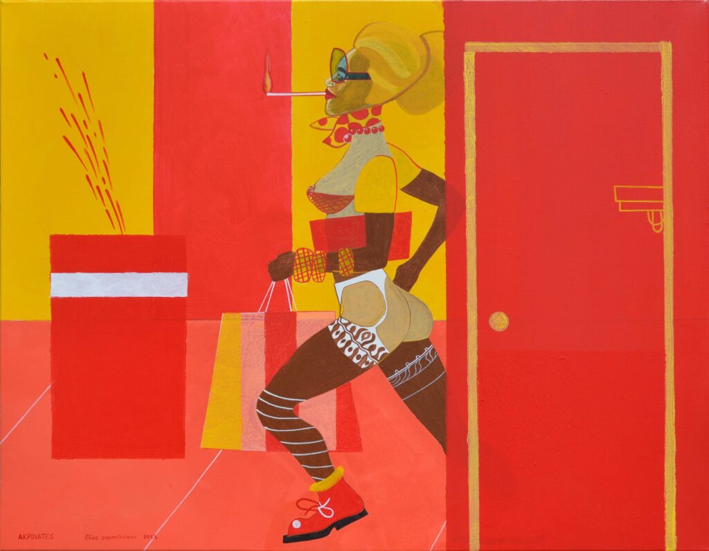 Η αίσθηση των κοινωνικών ρόλων που εντοπίζουμε στον Μπουζιούκο, στον Ηλία Παπανικολάου, μετατρέπεται σε αστική περφόρμανς. Στην «Ακροβάτισσα» (2022), η μορφή κινείται μέσα στο ποπ σκηνικό της αστικής καθημερινότητας ως περφόρμερ της εικόνας της. Το σώμα της ισορροπεί ανάμεσα σε ρόλους, επιθυμίες και διακριτικά κοινωνικής αναγνώρισης. Κινούμενη με αυτοπεποίθηση και έντονη καταναλωτική σημειολογία, η παρουσία της επιβεβαιώνει την κατασκευή της ατομικής ταυτότητας στο δημόσιο χώρο. Και η πόρτα, ως ορατό όριο, υπογραμμίζει ότι κάθε εικόνα είναι και ένα πέρασμα ανάμεσα στο ιδιωτικό και στο δημόσιο.