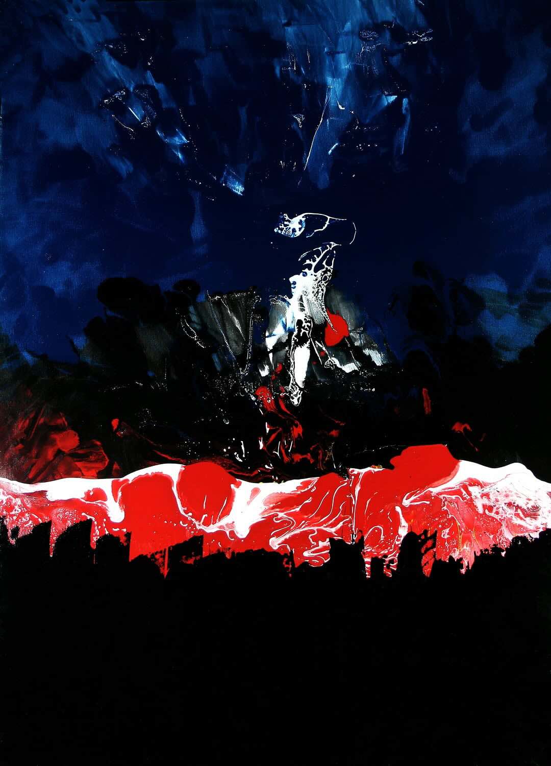 Ως γαλαξιακό ίχνος που αναδύεται μέσα σε μια σκοτεινή, σχεδόν νυχτερινή ζωγραφική ύλη στο «Νένιμα» (2025) του Αστέριου Τόρη, η γυναικεία μορφή δεν εμφανίζεται ως πρόσωπο ή σώμα. Σε μια σύνθεση με δυνατές εξπρεσιονιστικές χρωματικές αντιθέσεις βαθύ μπλε, μαύρου και μια έντονη λευκοκόκκινη ζώνη που δημιουργεί ρήγμα στη σύνθεση, η μορφή μικρή και φωτεινή, στέκει στο κέντρο τη στιγμή της ανάδυσής της από το κενό. Εδώ, το βλέμμα αναμετριέται με το βάθος του κενού, του γαλαξία, της ψυχής.