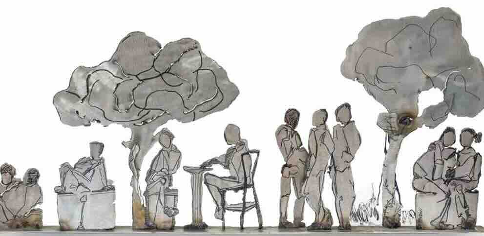 Η τυποποίηση των ανθρώπινων μορφών μέσα σε αυτά τα δομημένα περιβάλλοντα παραπέμπει στους τρόπους με τους οποίους οι αστικοί χώροι διαμορφώνουν τις κοινωνικές αλληλεπιδράσεις και τη συλλογική ύπαρξη. Μέσα από αυτό το πρίσμα, το έργο της Δουζένη, γίνεται ένα σχόλιο για την αλληλεπίδραση μεταξύ των ανθρώπων και του δομημένου περιβάλλοντος, τονίζοντας ότι ο αστικός χώρος δεν φιλοξενεί μόνον την ανθρώπινη δραστηριότητα αλλά την καθορίζει και την οργανώνει διακριτικά.