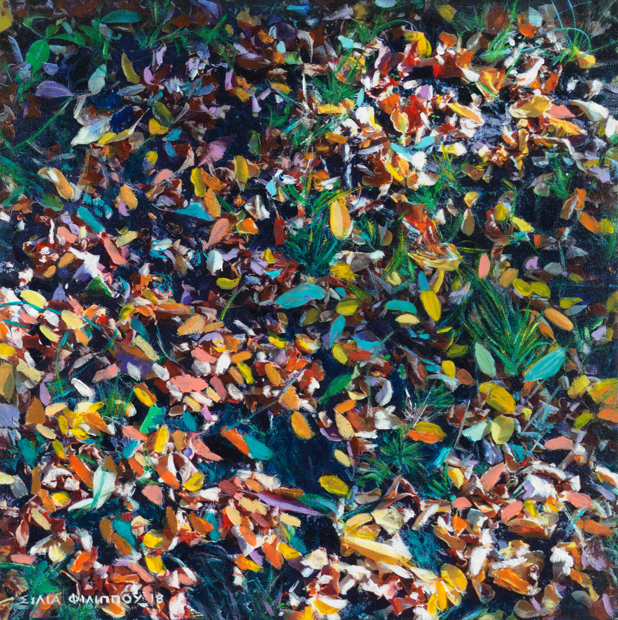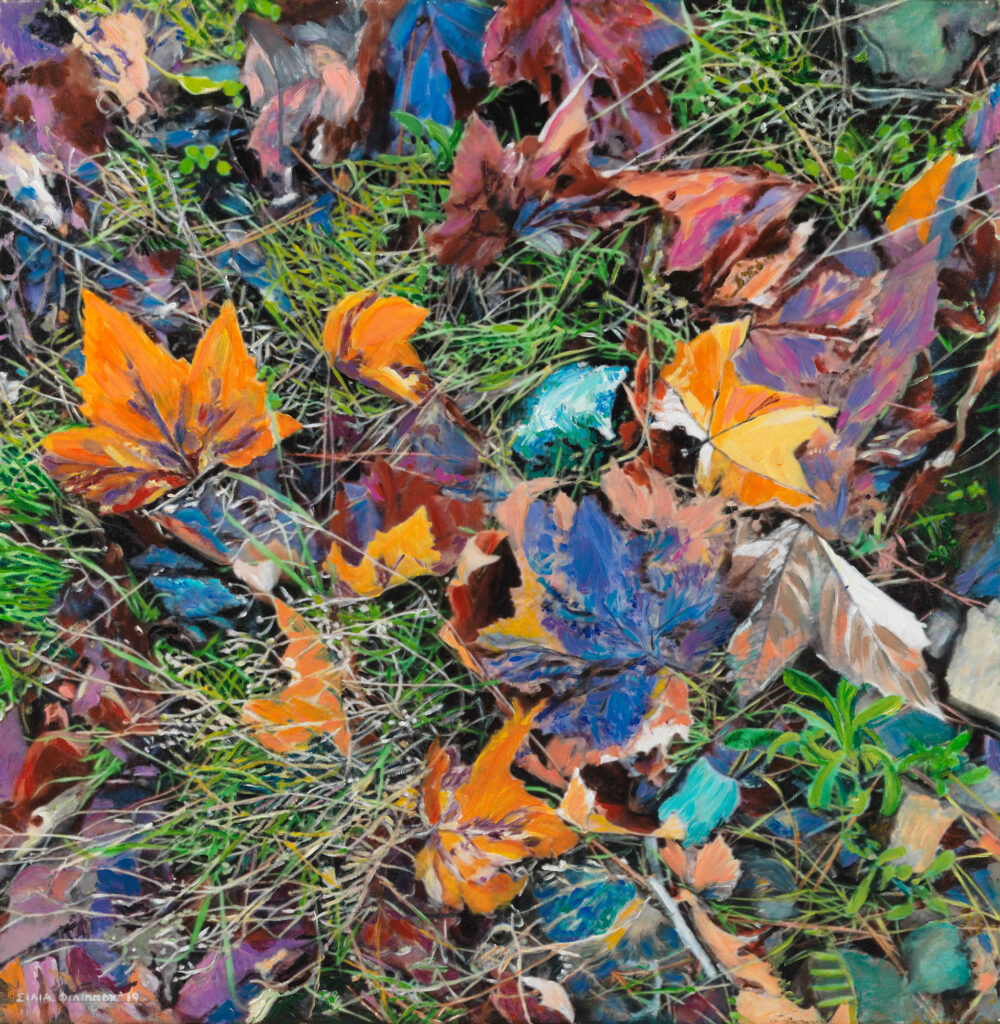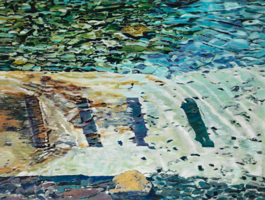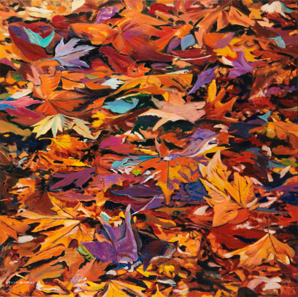 Τα χρώματα είναι τα εργαλεία της Σίλιας Φιλίππου, για να αποτυπώσει τον ιριδισμό του φωτός στο νερό, τη ροή, τη διαφάνεια και τις αντανακλάσεις του. Ο ήχος της ροής του, το θρόισμα των φύλλων και η απαλή κίνηση του αέρα μετατρέπονται σε χρωματικούς συνδυασμούς αισθήσεων. Τα κοντινά πλάνα μεγεθύνονται για να αποκαλύψουν το μεγαλείο της ουσίας τους. Το γαλάζιο της θάλασσας, οι φωτεινές αντανακλάσεις, το ρέον νερό, η διαφάνεια και οι ιριδίζουσες αποχρώσεις, όλα όσα μπορεί να συλλάβει το μάτι, αποτυπώνονται στους μουσαμάδες της με συναισθηματική εκφραστικότητα και όχι με φωτογραφική πιστότητα. Η φύση δεν είναι απλώς το περιβάλλον του ανθρώπου, είναι η πιο αγνή πηγή των συναισθημάτων!
