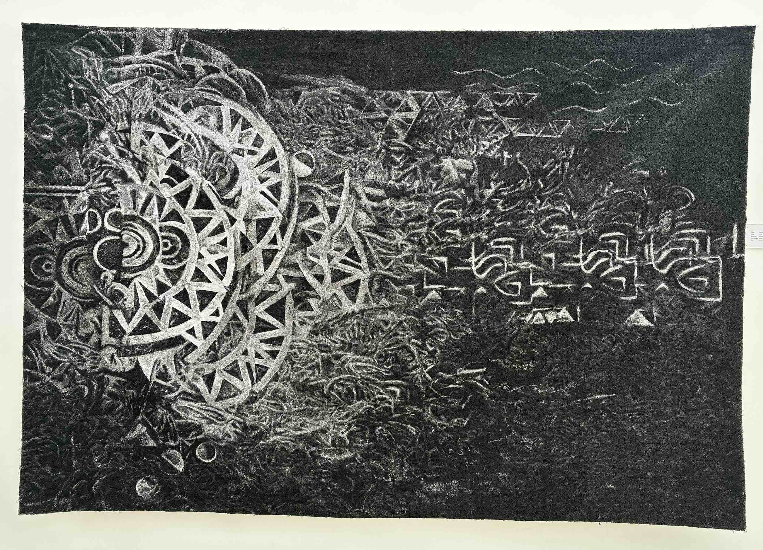 For example, the work The Source of Dreams (2019, cotton thread and velvet embroidery, 220×150 cm) is a monumental gesture of abstract cosmogony. The composition is a dense, complex mesh of circular and linear motifs moving from left to right, appearing to dissolve or explode into a fluid, hybrid substance. Like a recomposition of symbolic elements—constellations, scripts, architectural traces—the work transforms into a dreamlike diagram of consciousness suspended between order and chaos, geometry and intuition.