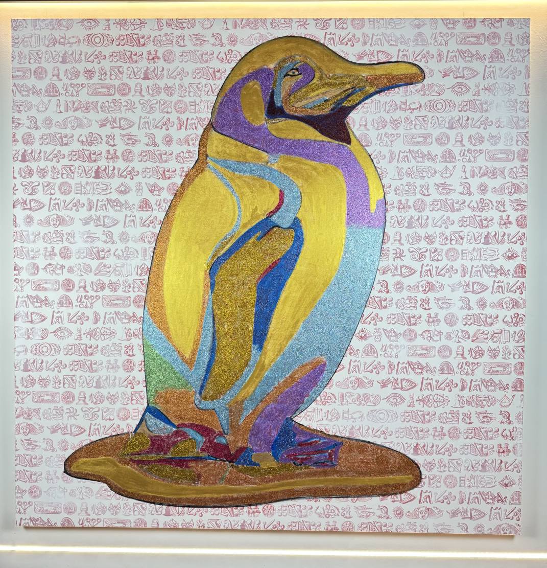Η κωδικοποιημένη ευπάθεια του Πιγκουίνου που λιώνει είναι ένα χρωματικό καλειδοσκόπιο από χρυσό, μωβ, γαλάζιο, βαθύ μπλε, πράσινο, κόκκινο και σιέννα. Η περήφανη στάση του καθώς λιώνει μπορεί να είναι ένα άμεσο σχόλιο στις συνθήκες αποσύνθεσης του φυσικού του περιβάλλοντος, πιο πολύ όμως, το καθιστά ένα τοτέμ αθωότητας που λιώνει κάτω από το βάρος της ανθρώπινης αποτυχίας. Δεν υπάρχει πάγος, θερμόμετρο, ή βιομηχανικό σκηνικό. Περιτριγυρισμένος ο πιγκουίνος, από τα ιδεογράμματα της Γραμμικής Α που υπάρχουν στον μυστηριώδη Δίσκο της Φαιστού, μια οπτική γλώσσα τόσο αρχαία όσο και φουτουριστική, το έργο γίνεται μνημείο για τους μελλοντικούς πολιτισμούς που θα προσπαθήσουν να αποκρυπτογραφήσουν τους λόγους και τις αιτίες για τις οποίες ο πλανήτης οδηγήθηκε στην κλιματική κατάρρευση.